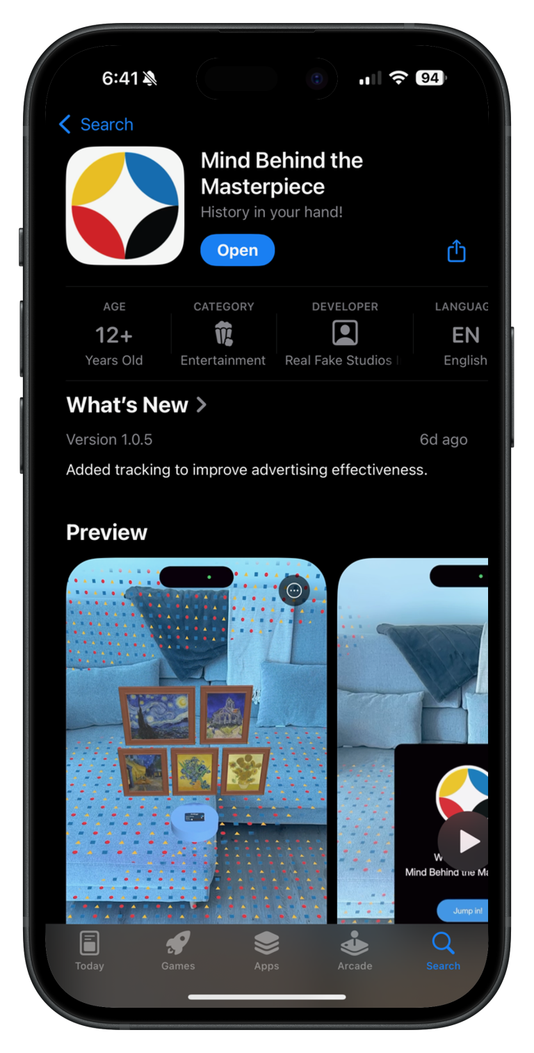 Our app The Mind Behind the Masterpiece uses augmented reality to bring iconic paintings into your space, revealing the stories and artists behind them.